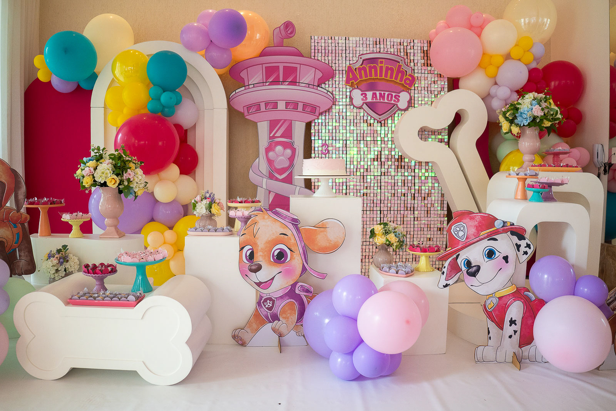 Esqueça o azul e vermelho tradicionais. A decoração da Ana foi toda trabalhada em tons de rosa, trazendo uma delicadeza única para o tema Patrulha Canina. Cada detalhe da mesa refletia a personalidade doce da aniversariante.